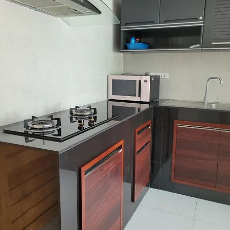 Villa buzdolabı, mutfak gereçleri ile donanımlı bir mutfak içerir.